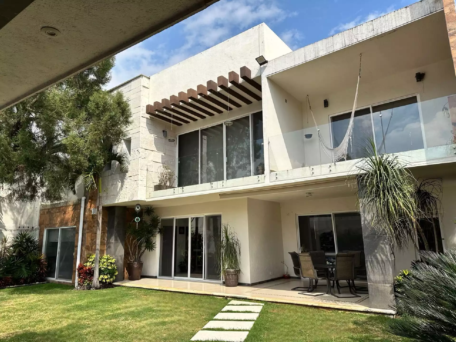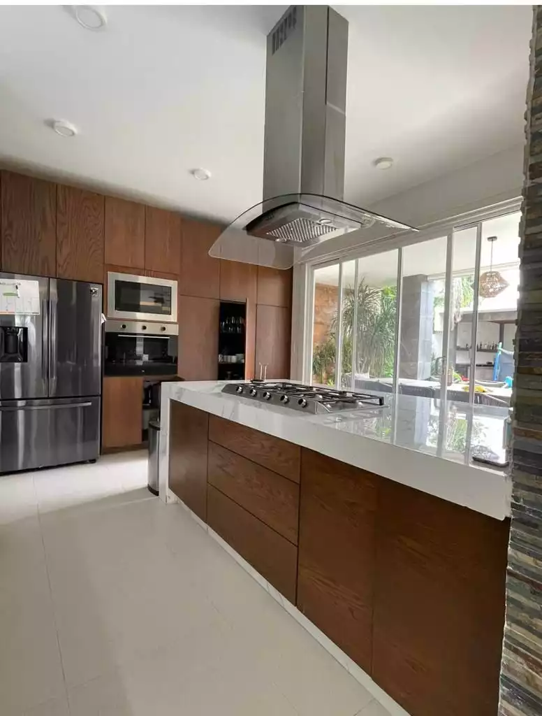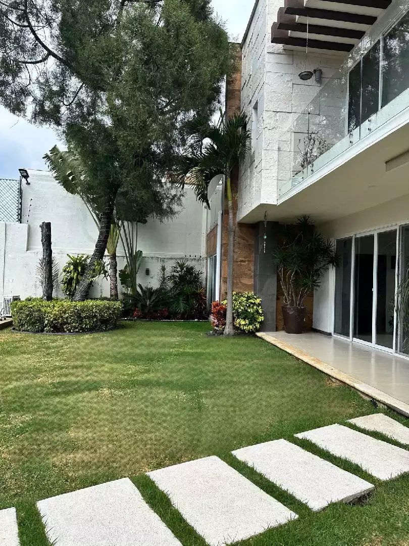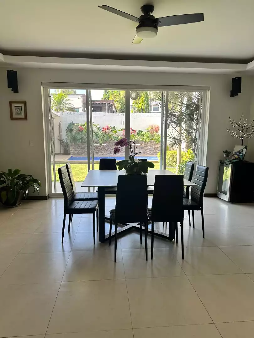 Planta baja: - 1 recámara con baño completo y clóset - 1 oficina - sala y comedor muy amplios - cocina integral equipada - 1 baño completo de visitas - 1 bodega - cuarto de lavado o servicio - alberca equipada - jardín amplio - 2 terrazas - 1 bar en terraza